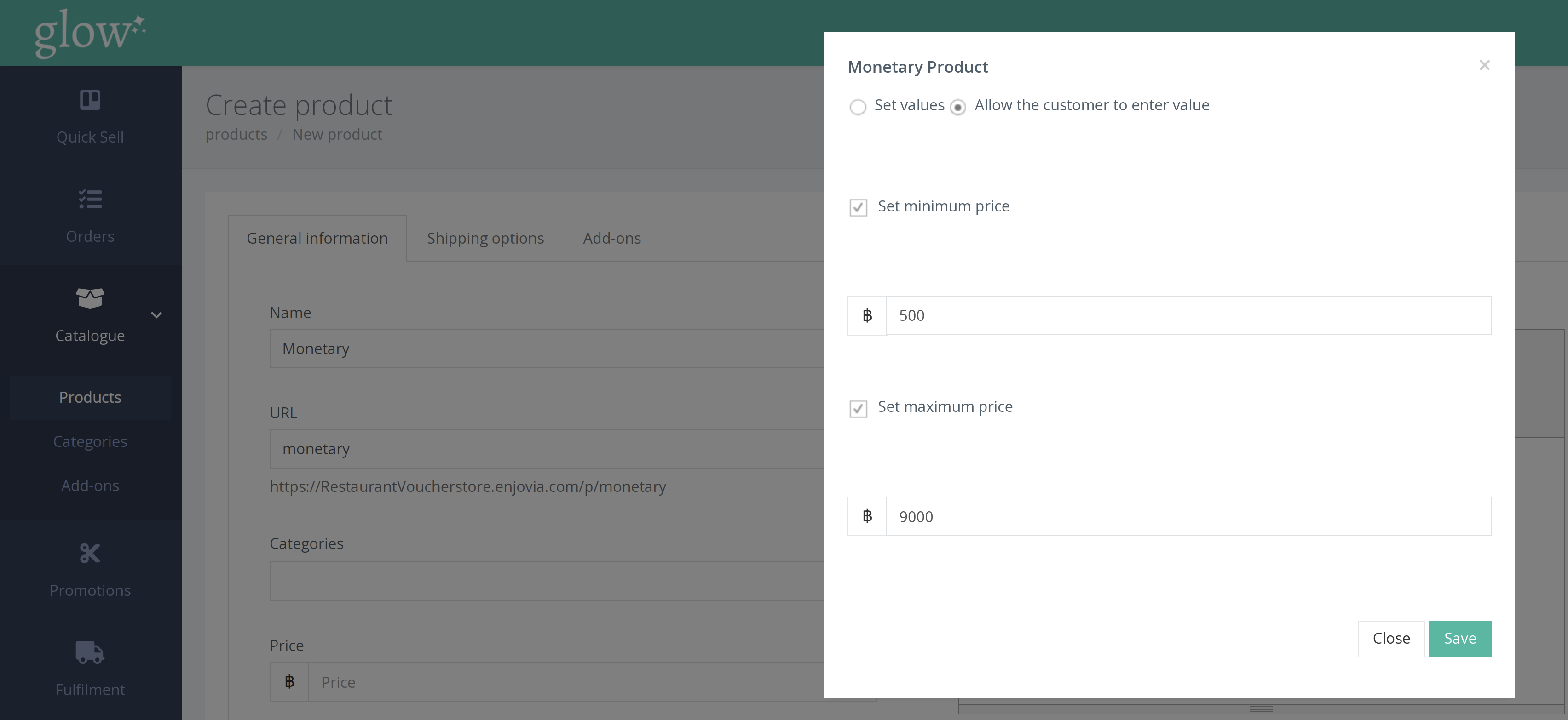 ตัวเลือกนี้ให้ความยืดหยุ่นมากขึ้นแก่ลูกค้าโดยอนุญาตให้พวกเขากำหนดราคาของตนเอง หากต้องการ คุณสามารถป้อน ‘minimum value’ และ/หรือ ‘maximum value’ ที่ลูกค้าสามารถซื้อได้ในเวาเชอร์เดียว ก่อนคลิก [Save]
